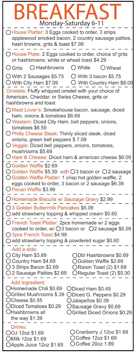 The menu features an impressive array of breakfast options, highlighted by the fluffy meats omelet and the delectable mix-and-match specials, ensuring that every morning feels like a treat. Customers rave about the fried chicken, perfectly tender and seasoned, making it a lunchtime favorite. Don't miss the crispy okra and the unforgettable cabbage casserole, a dish that captures the essence of home-cooked goodness.